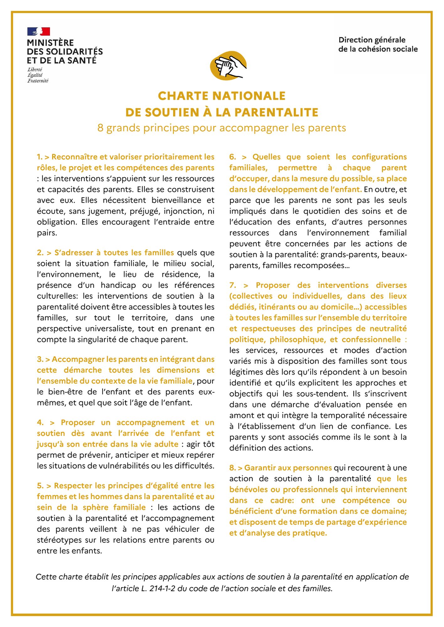 En mars 2022, est publié l’arrêté du 9 mars 2022 portant création d’une charte nationale de soutien à la parentalité. Il précise les principes applicables aux services et actions de soutien à la parentalité :