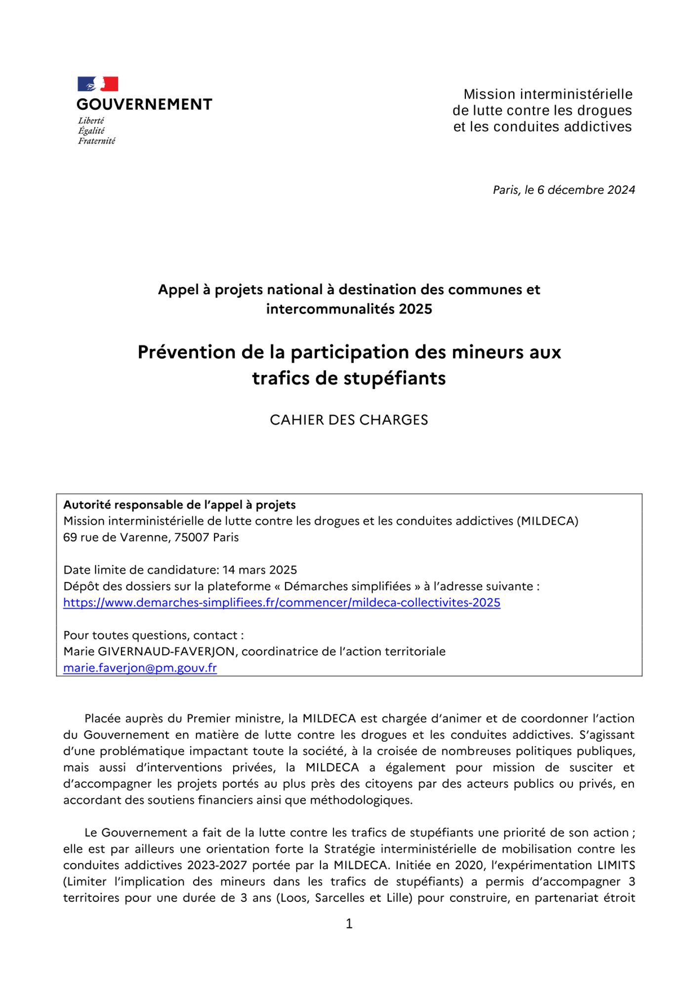Les dossiers de candidature sont à déposer sur la plateforme démarche simplifiée avant le 14 mars 2025 ici : https://www.demarches-simplifiees.fr/commencer/mildeca-collectivites-2025