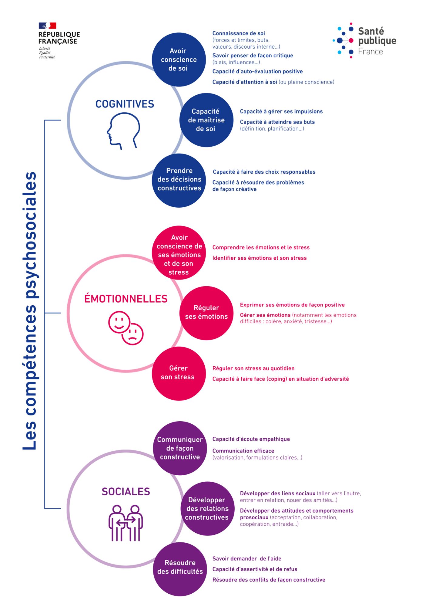 Ce document contient notamment une infographie résumant visuellement les trois catégories qui permettent de répartir neuf compétences générales auxquelles font références les compétences psychosociales :