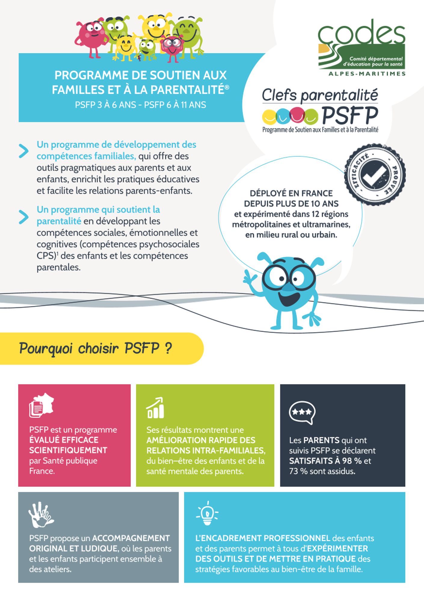 SON EFFICACITÉ est attestée internationalement par de nombreuses études scientifiques: 38 pays proposent aujourd’hui PSFP. La France est le 10ème pays européen à avoir validé sa version, adaptée à la culture et au contexte français. Il est recommandé par Santé Publique France et la MILDECA.